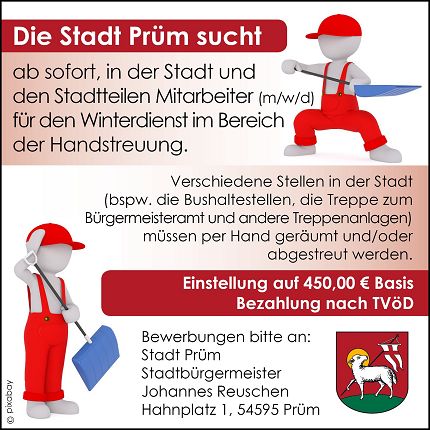 Ab sofort, in der Stadt und den Stadtteilen Mitarbeiter (m/w/d) für den Winterdienst im Bereich der Handstreuung.