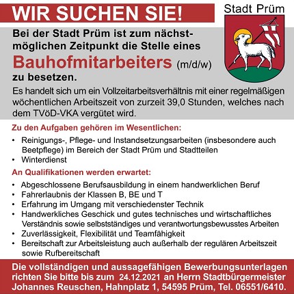 Bei der Stadt Prüm ist zum nächstmöglichen Zeitpunkt die folgende Stelle zu besetzen: