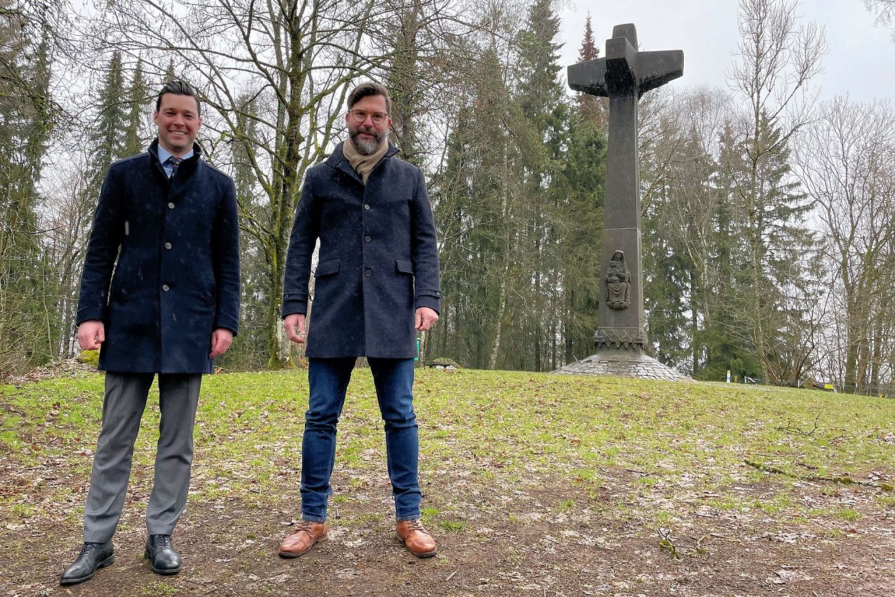 Bild: Vor Ort begutachteten Stadtbürgermeister Johannes Reuschen (l.) sowie Christian Nathem (Westenergie) sowie die neuen LED-Anstrahlleuchten am Kalvarienkreuz. (Foto: David Kryszons/Westenergie)