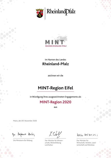 Die Auszeichnung "MINT-Region Eifel" ist ein Türöffner zu einem rheinland-pfälzischen MINT-Netzwerk, das mit seiner Geschäftsstelle in Trier von nun an auch in der Eifel immer wieder unterstützend tätig sein wird.